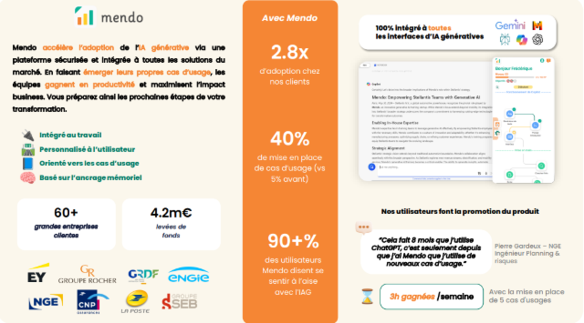 Mendo aide les managers et leurs équipes commerciales à intégrer l’IA dans leurs process et favorise l’adoption par les collaborateurs de leur cas d’usage métier, sans sacrifier l’humain.